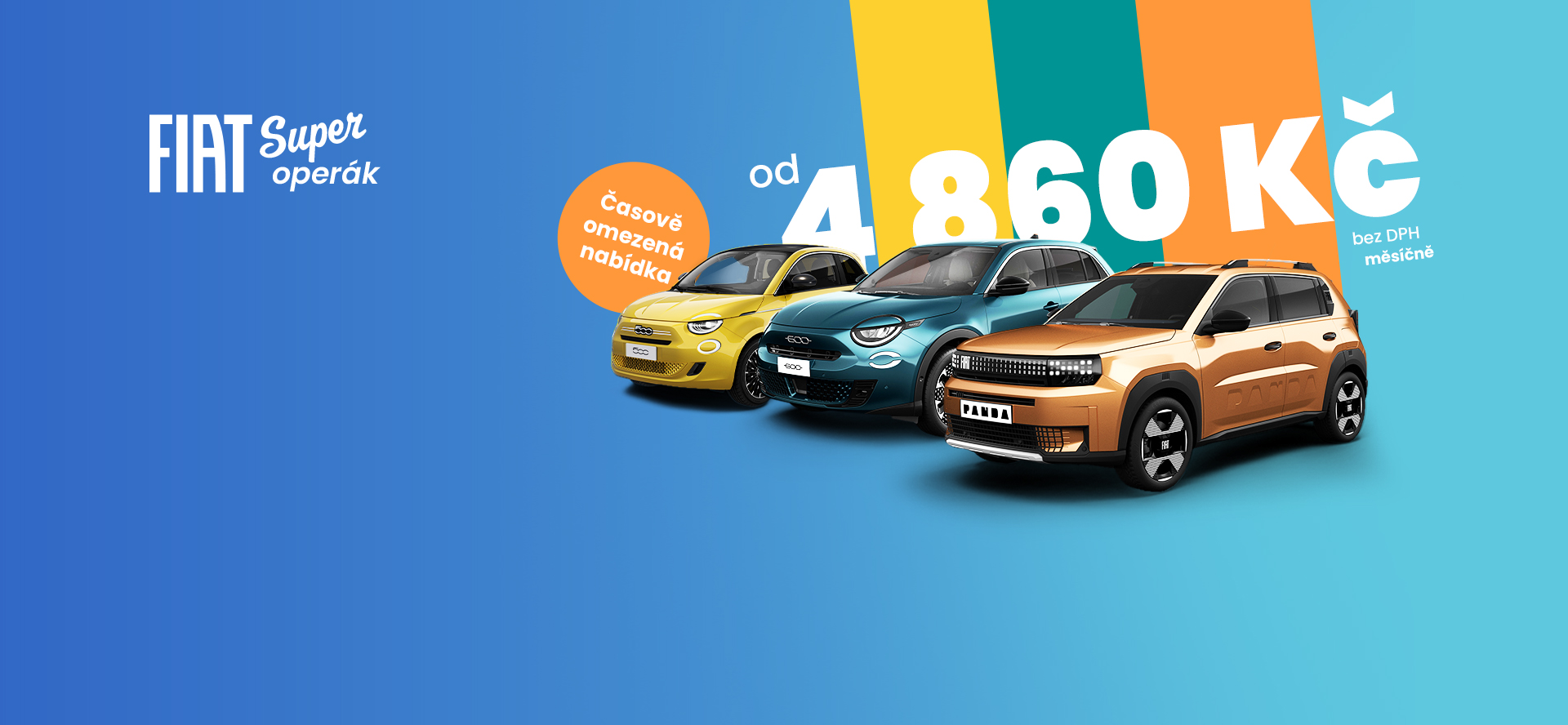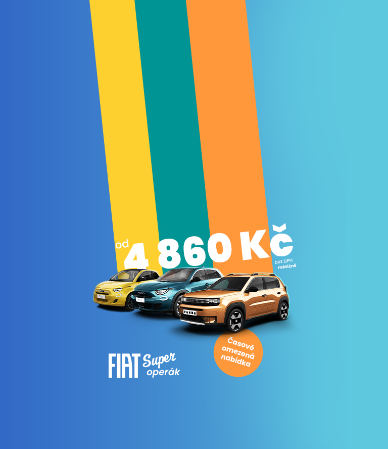 1) Měsíční splátka operativního leasingu 4 860 Kč bez DPH se vztahuje na Fiat 500 Hybrid La Prima 1.0 BSG Hybrid 65k MAN6 (302.T14.0). Ceníková cena vozidla 609 900 Kč včetně DPH; délka trvání smlouvy 36 měsíců / 30 000 km. Splátka neobsahuje pneuservis. Nabídka je určena pro právnické osoby a fyzické osoby podnikající, a vztahuje se na vozy objednané do 31. 3. 2026 nebo do odvolání. Nejedná se o závaznou nabídku na uzavření smlouvy. Nabídka operativního leasingu je poskytována ve spolupráci se společností Arval CZ, s.r.o. Více informací o nabídce u autorizovaných prodejců Fiat.